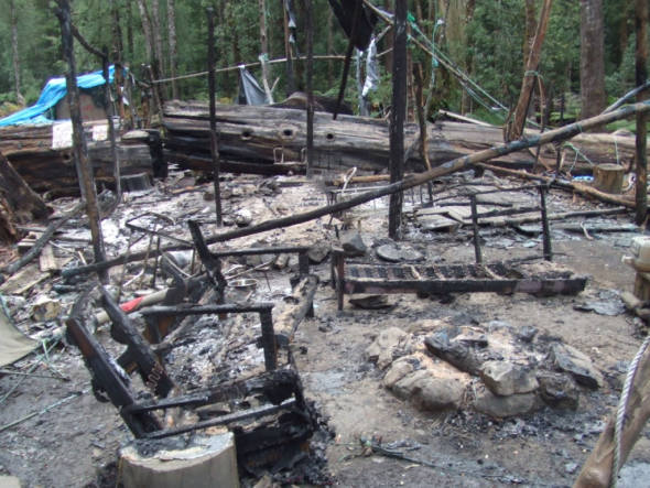 Ed: Real Tasmanians out there defending disappearing ancient forests – just a committed five on a remote bridge forming the last and only line of defence to prevent logging trucks, corporate loggers, and corrupt Tasmanian police who know the arsonists that set fire to peaceful Camp Flozza and to the forest west.